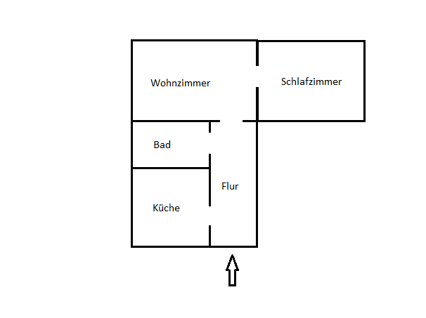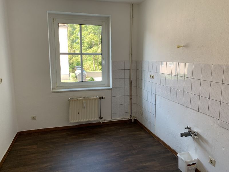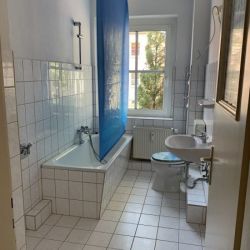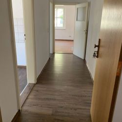 Alle Wände sind Raufaser weiß frisch gestrichen. Bis auf das Wohnzimmer sind alle Räume mit Bodenbelag ausgestattet. Im Flur gibt es einen Laminatboden in Holzkistendekor, im Schlafzimmer einen einfachen PVC-Belag in Holzoptik, in der Küche ist dunkler moderner PVC-Belag in Dielenoptik verlegt und das Badezimmer ist mit Bodenfliesen ausgestattet. Neben Waschbecken und WC verfügt das Badezimmer über eine Badewanne. Hier befindet sich auch der Waschmaschinenanschluss. In der Küche gibt es einen Fliesenspiegel im Bereich der Arbeitsfläche sowie eine Herdanschlussdose für einen Elektroherd.
